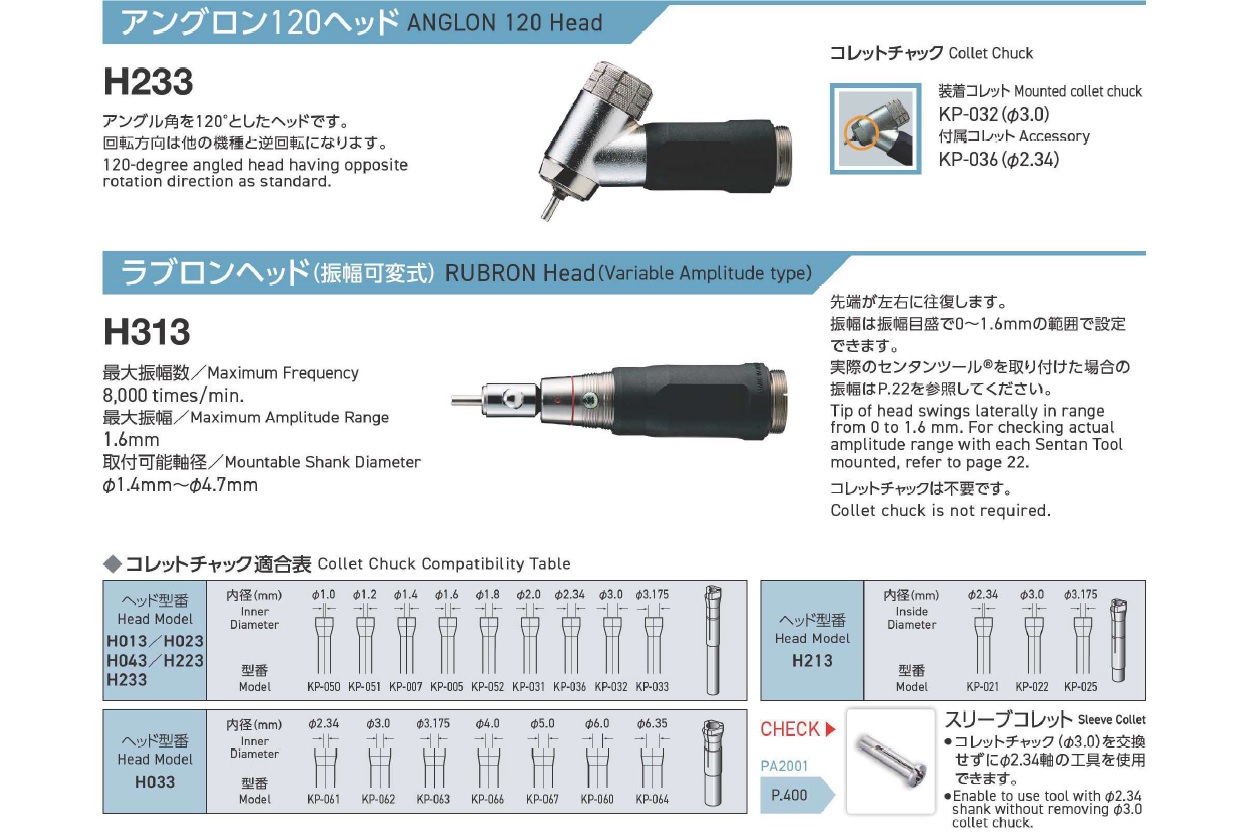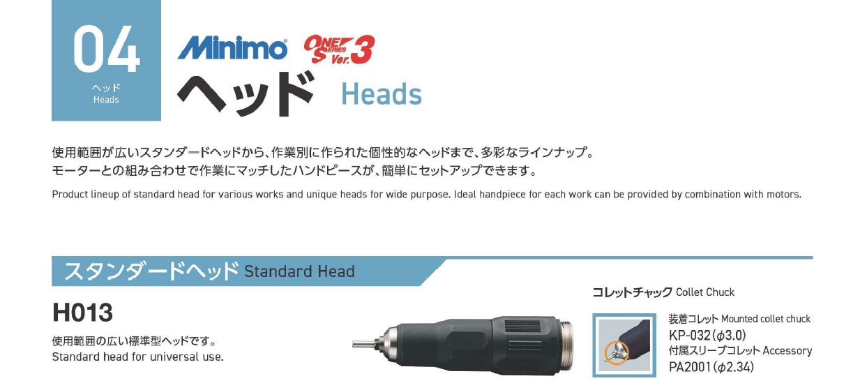 Minimo Precision Electric Hand Grinder, Standard head, Slender head, Heavy duty head, Long slender head, Anglon head, Heavy duty anglon head, Anglon 120 hend, Rubron head (variable amplitude type)Collet chuck compatibility table