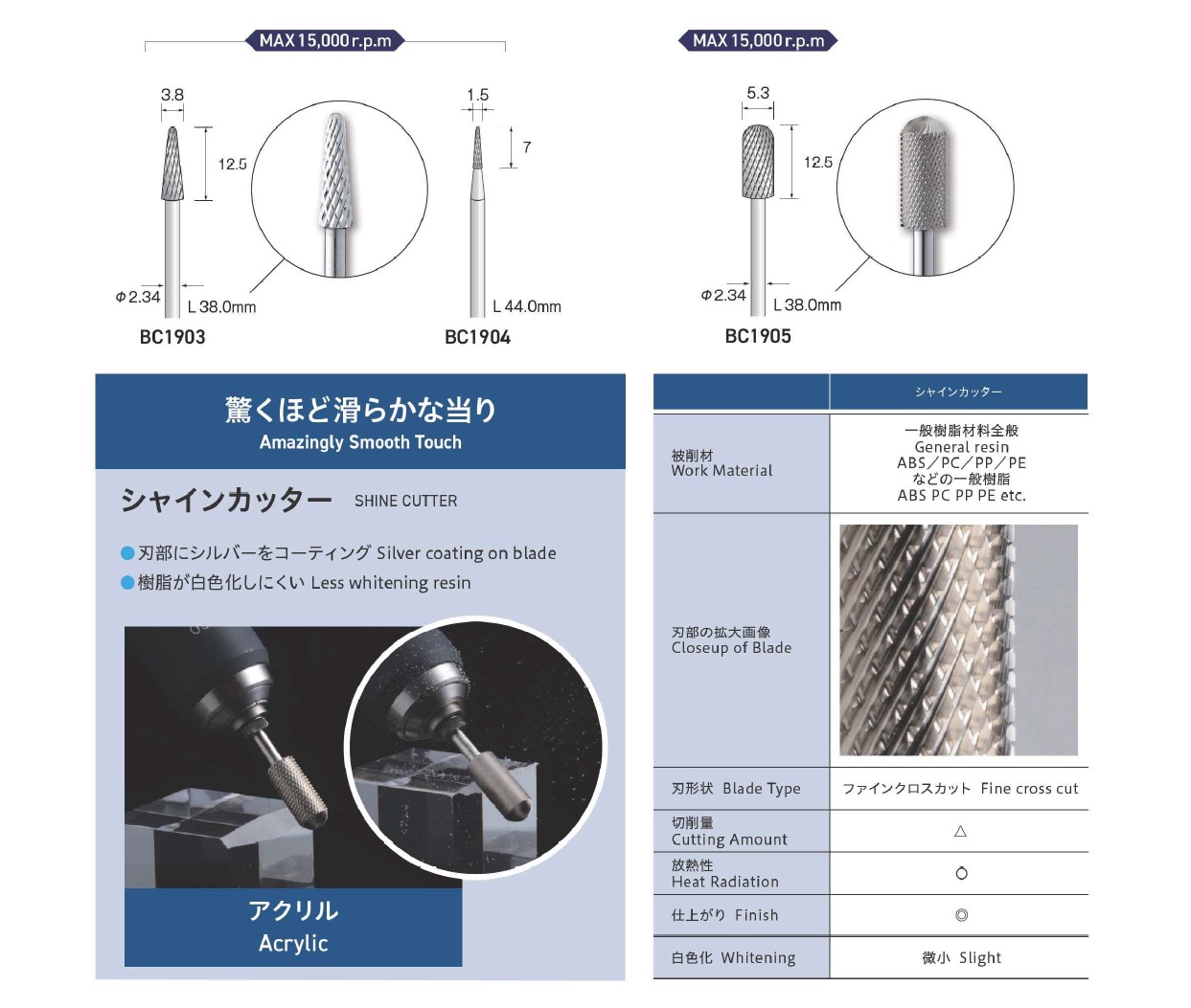 Minimo Carbide Cutters, CB Cutters, Long Shaft Carbide, Ceramic Cutter, CuttersSpiral cut, Spiral chip breaker cut, Straight cut, Cross cut, Fine cross cut, Reamer, Grooved cross cut, Shine cutter, Aluminium cut, Micro cut, Ceramic cutter