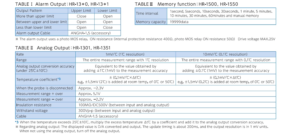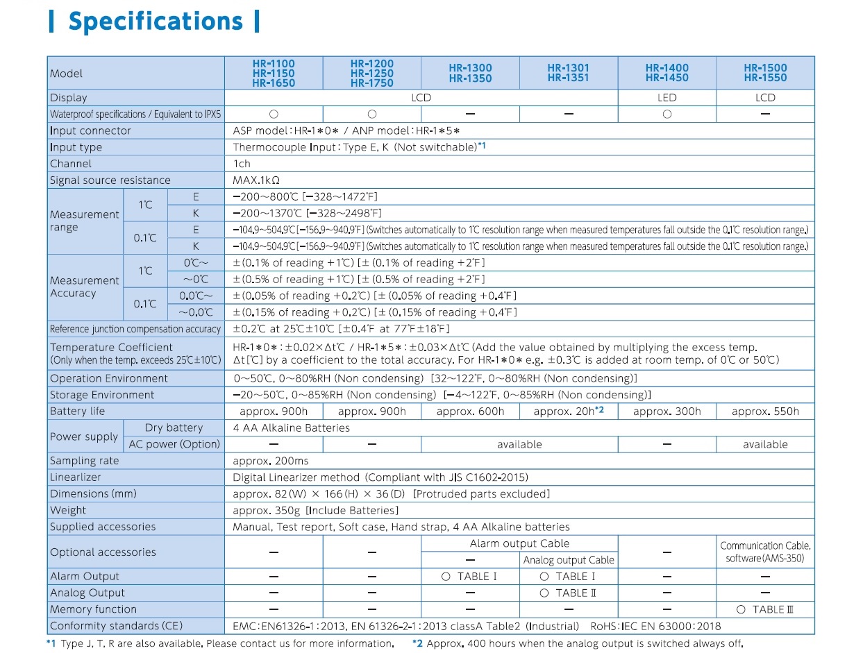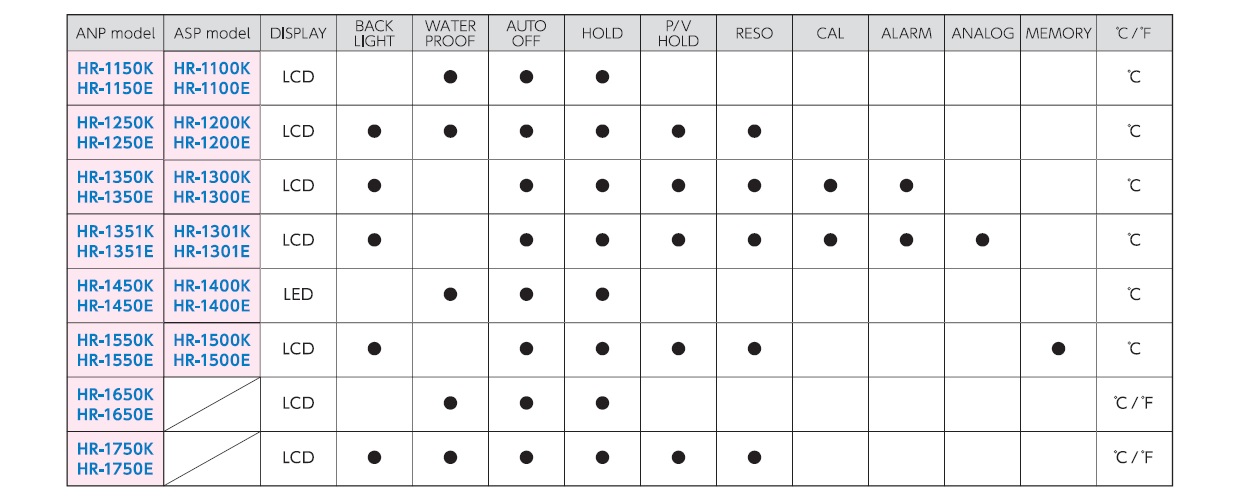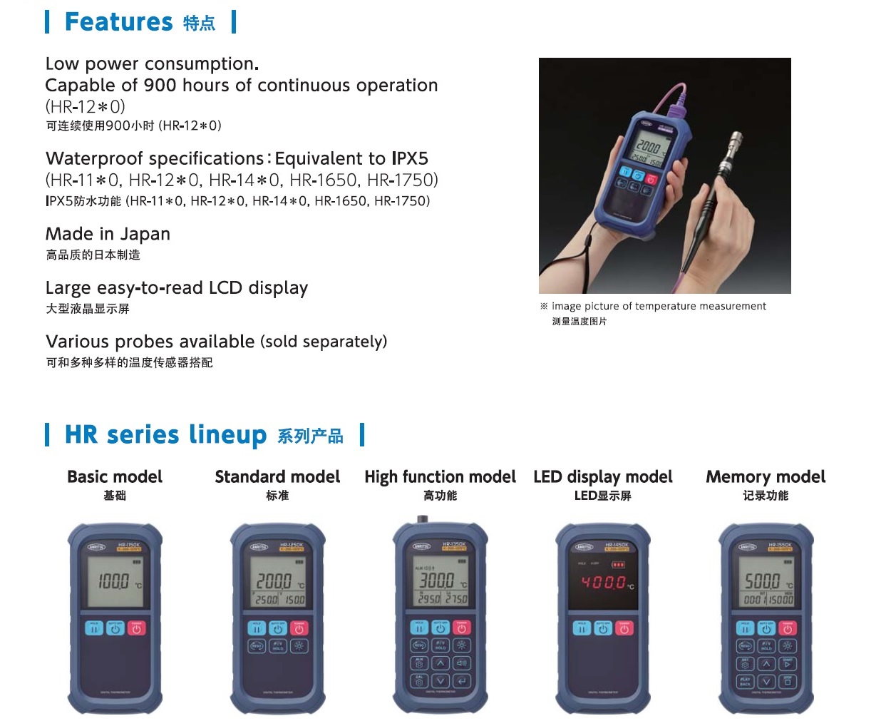 Anritsu Handheld Thermometer, HR series Lineup, Basic model, Standard model, High function model, LED display model, Memory model