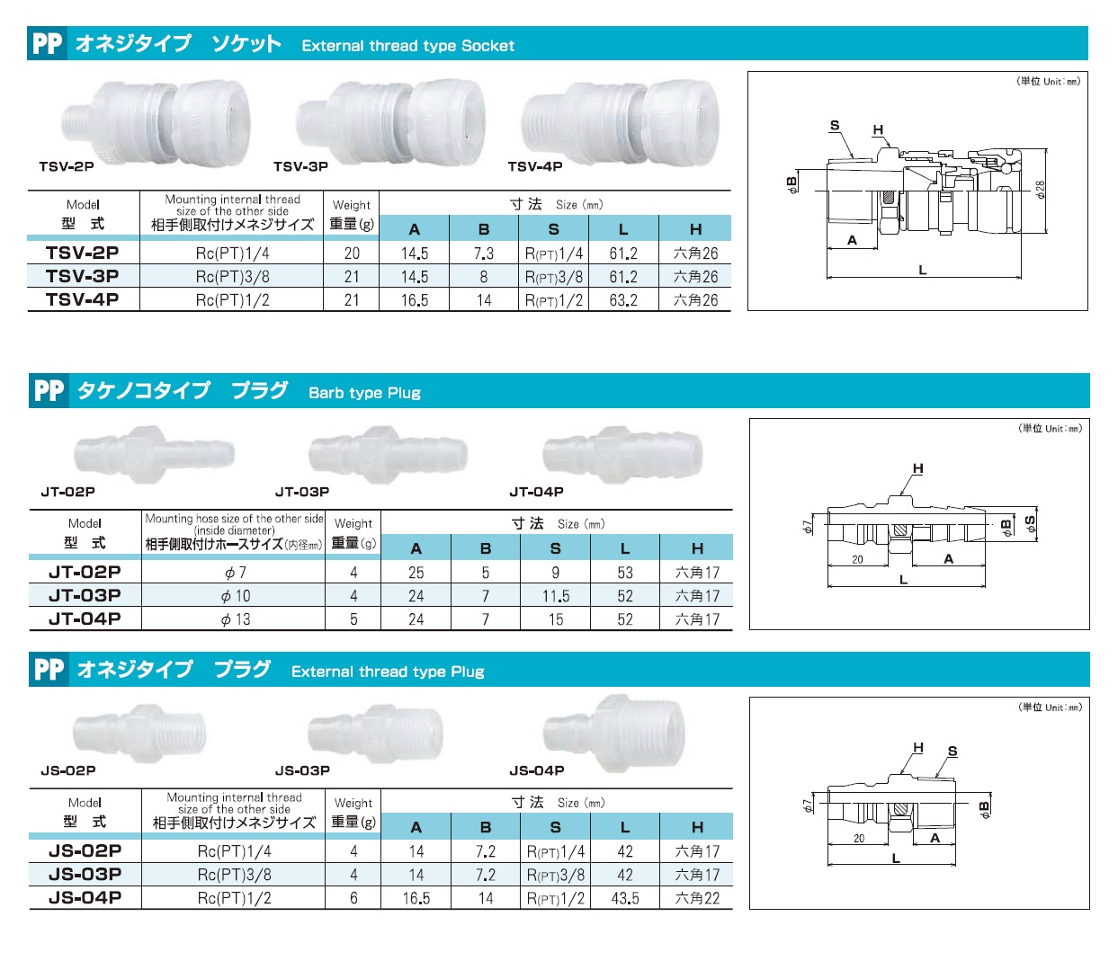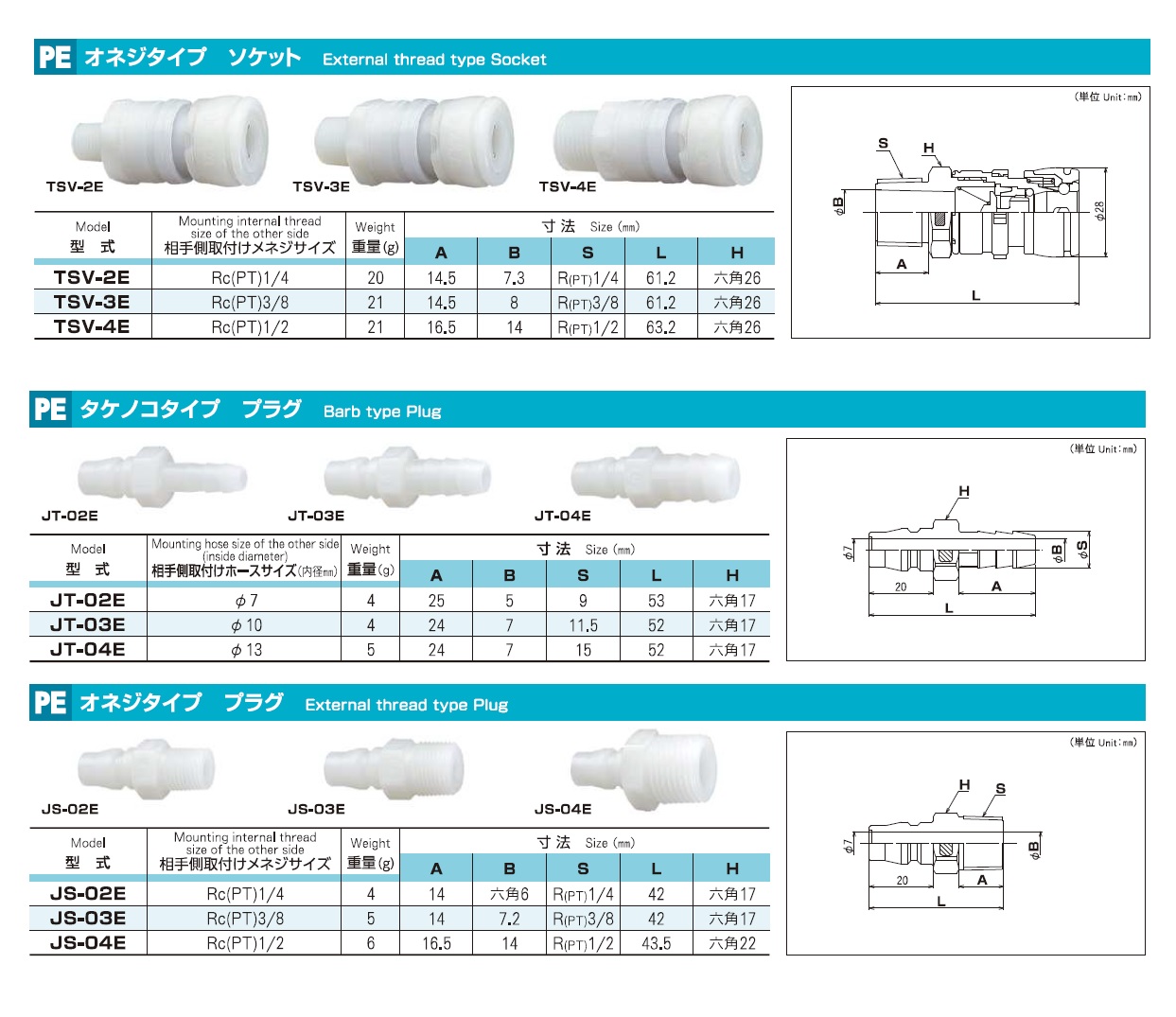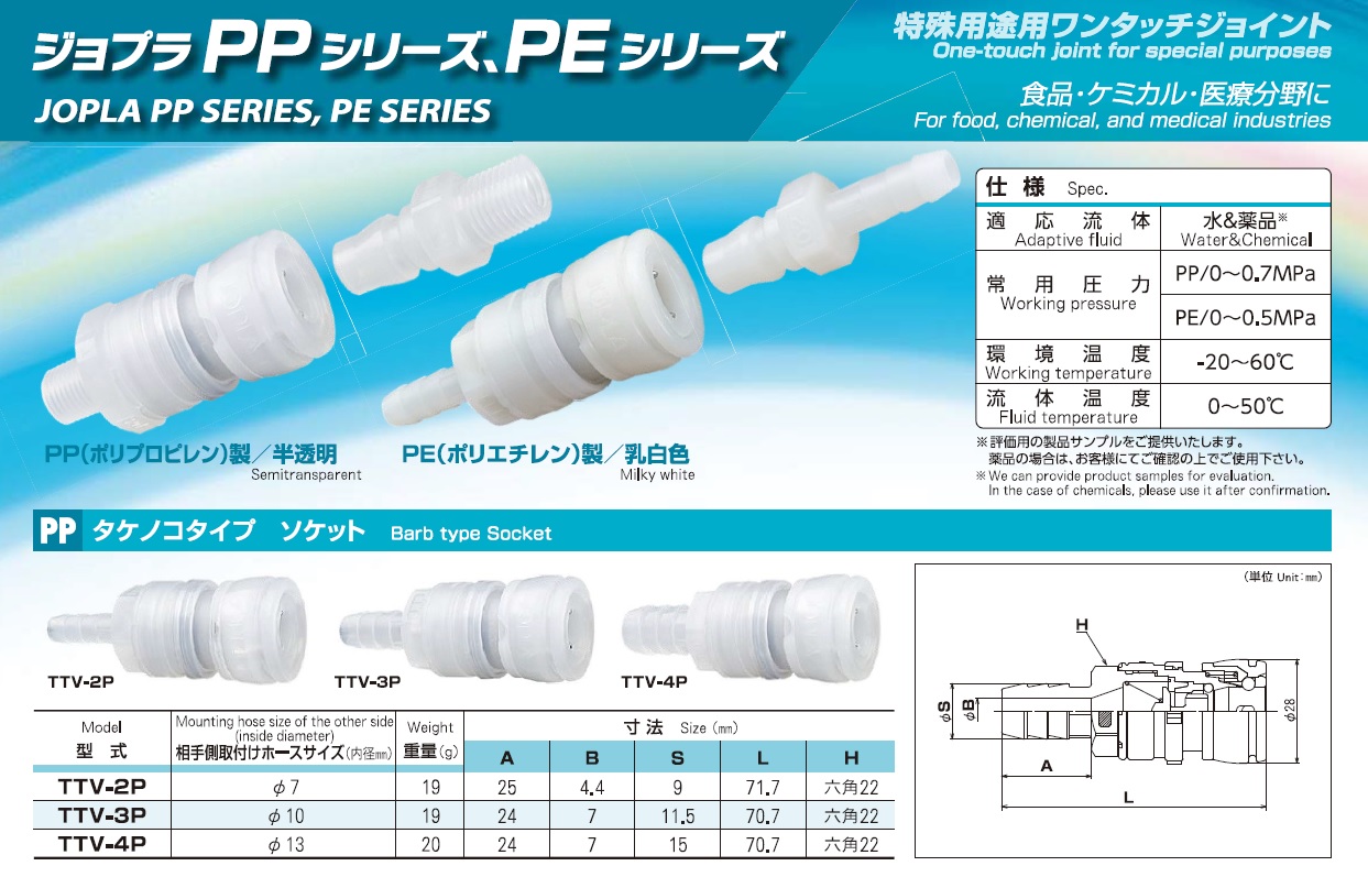 Joplax Jopla PP Series, PE Series, One-Touch Joint for Special Purposes, Barb Type Socket, External Thread Type Socket, Barb Type Plug